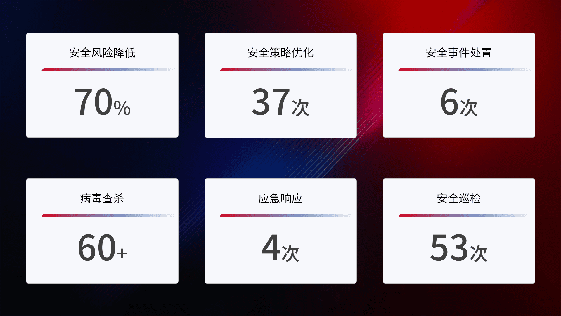 提供全面的安全事件报告体系,,,包括处置报告、、、周报、、季度和年度总结,,,结合持续监控,,,帮助客户深入了解网络安全状况。。。