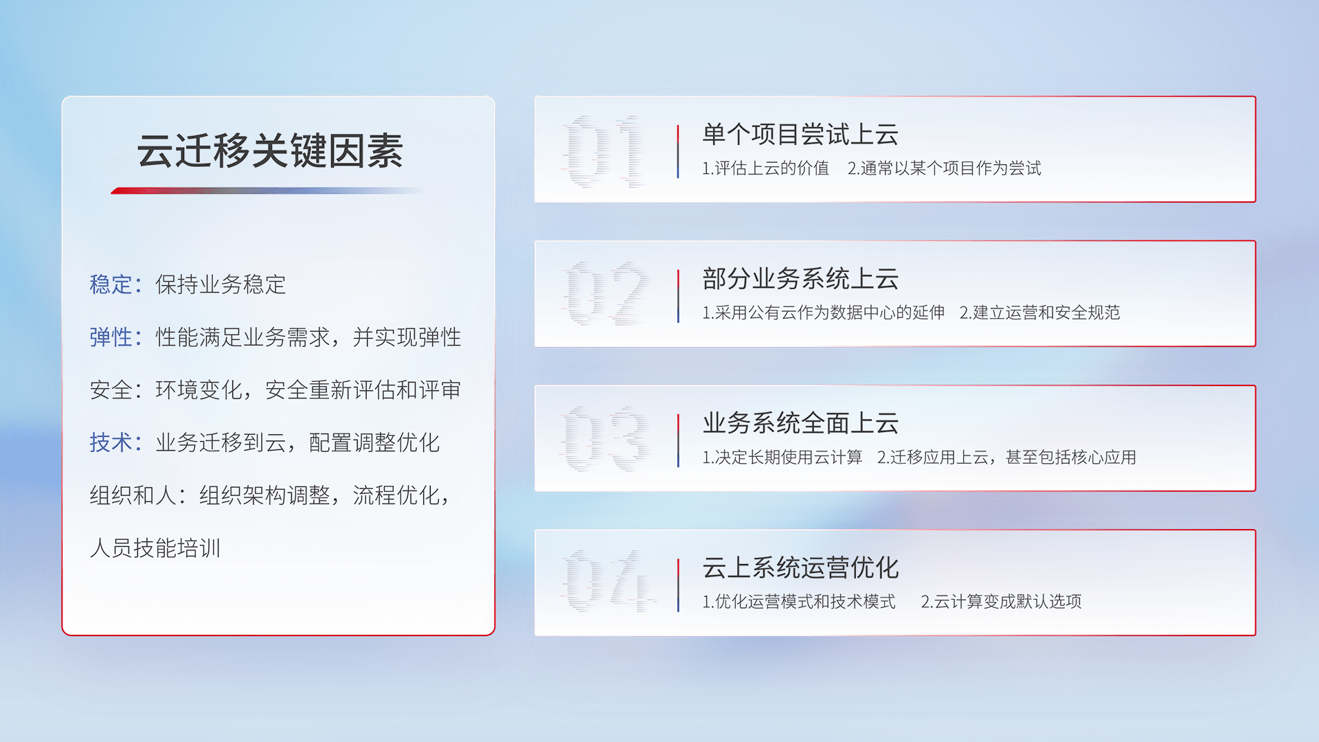 结合实际业务,,从规划设计、、云平台选型、、云原生改造、、、、数据迁移、、、、集成交付,,迁移全过程为客户识别最佳上云路径,,,,做好风险识别管理,,,设计网络架构、、、身份权限、、安全审计合规、、、操作审计、、、、日志审计、、、监控告警策略、、、、多站点容灾设计等,,,对云上基础设施进行整体规划,,提升IT治理水平,,以满足弹性、、、高可用、、、高性能的需求。。